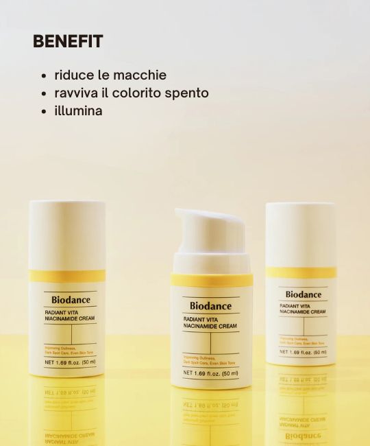 Radiant Vita Niacinamide Cream è una crema illuminante che ha lo scopo di ridurre le macchie, rivitalizzare il colorito spento, dare luminosità e radiosità alla pelle.