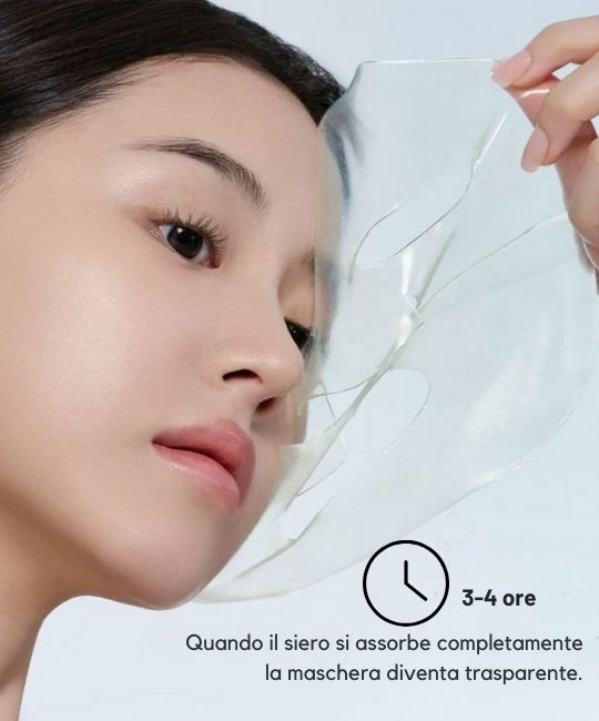 Il supporto in hydrogel è infuso di siero e inizialmente la maschera si presenta lattiginosa, diventando poi trasprarente quando il rilascio del siero è ultimato e rimane solo la pellicola hydrogel.